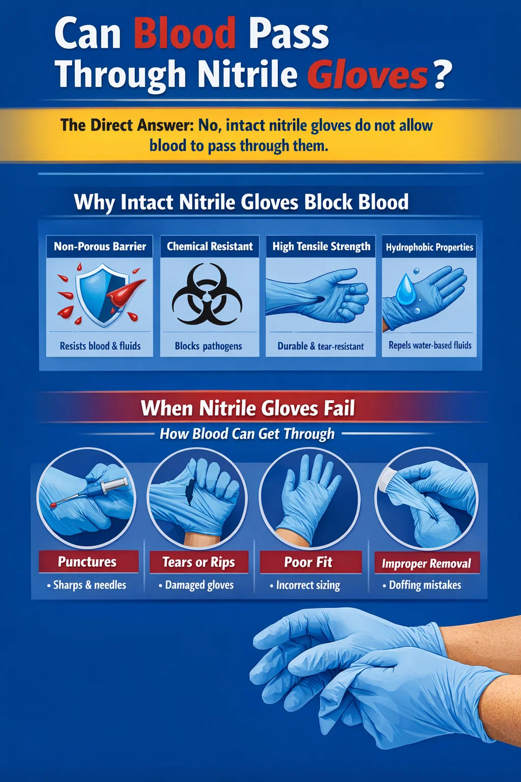 Qualquer luva de nitrilo vendida como luva de exame médico ou cirúrgica em mercados regulamentados deve passar nestes testes antes de chegar a ambientes clínicos. O teste de vazamento de água – onde cada luva amostrada é preenchida com um litro de água e suspensa por dois minutos – é projetado especificamente para confirmar que a luva forma uma barreira impermeável contra fluidos aquosos, dos quais o sangue é um deles.