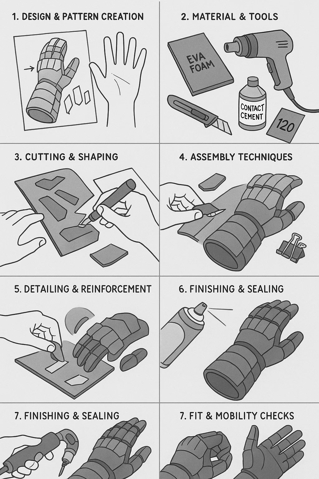 Criando EVA luvas de espuma ou manoplas é um método popular para projetos de cosplay, LARP ou fantasias. Aqui está uma análise prática do processo: