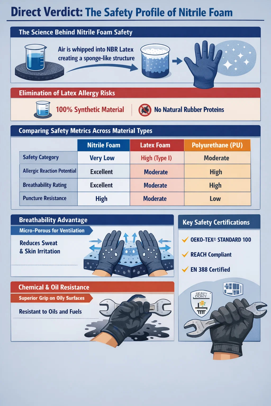 Para responder à pergunta diretamente: Sim, a espuma nitrílica é excepcionalmente segura para a grande maioria das pessoas e é frequentemente a escolha preferida para pessoas com pele sensível. Por ser um material 100% semtético, não contém nenhuma das proteínas da borracha natural que causam alergia ao látex. Além disso, espuma nitrílica é quimicamente inerte depois de curado, o que significa que não libera gases tóxicos ou resíduos nocivos durante o uso padrão, tornando-o um padrão da indústria para equipamentos de proteção.
