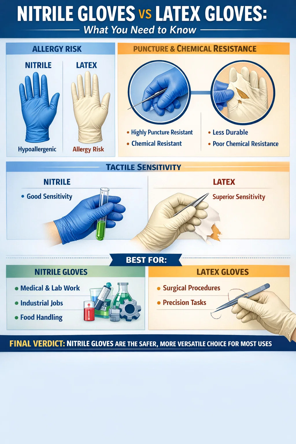 Dito isto, "mais seguro" depende do seu contexto específico. As luvas de látex ainda apresentam vantagens significativas em termos de sensibilidade tátil e elasticidade, tornando-as preferidas em determinados ambientes cirúrgicos e de procedimentos delicados. O objetivo deste artigo é detalhar claramente as diferenças para que você possa tomar uma decisão informada com base em seu caso de uso real – e não em uma recomendação única para todos.