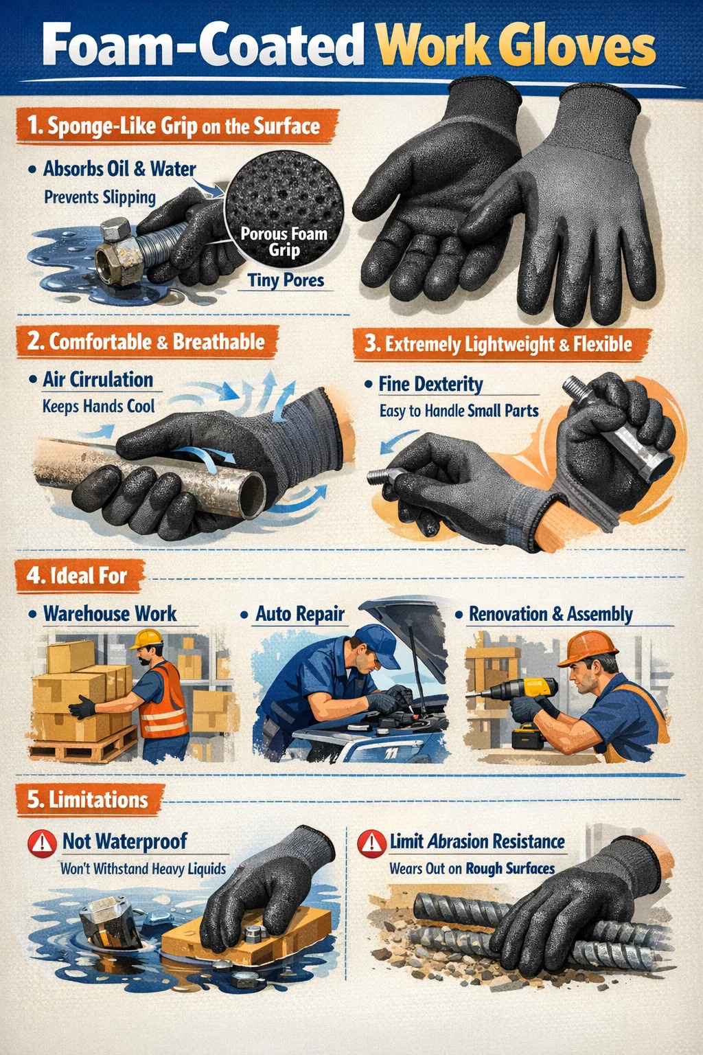 Fricção forte: Este revestimento de espuma é mais resistente que luvas de borracha lisa, proporcionando maior sensação de segurança durante o trabalho.