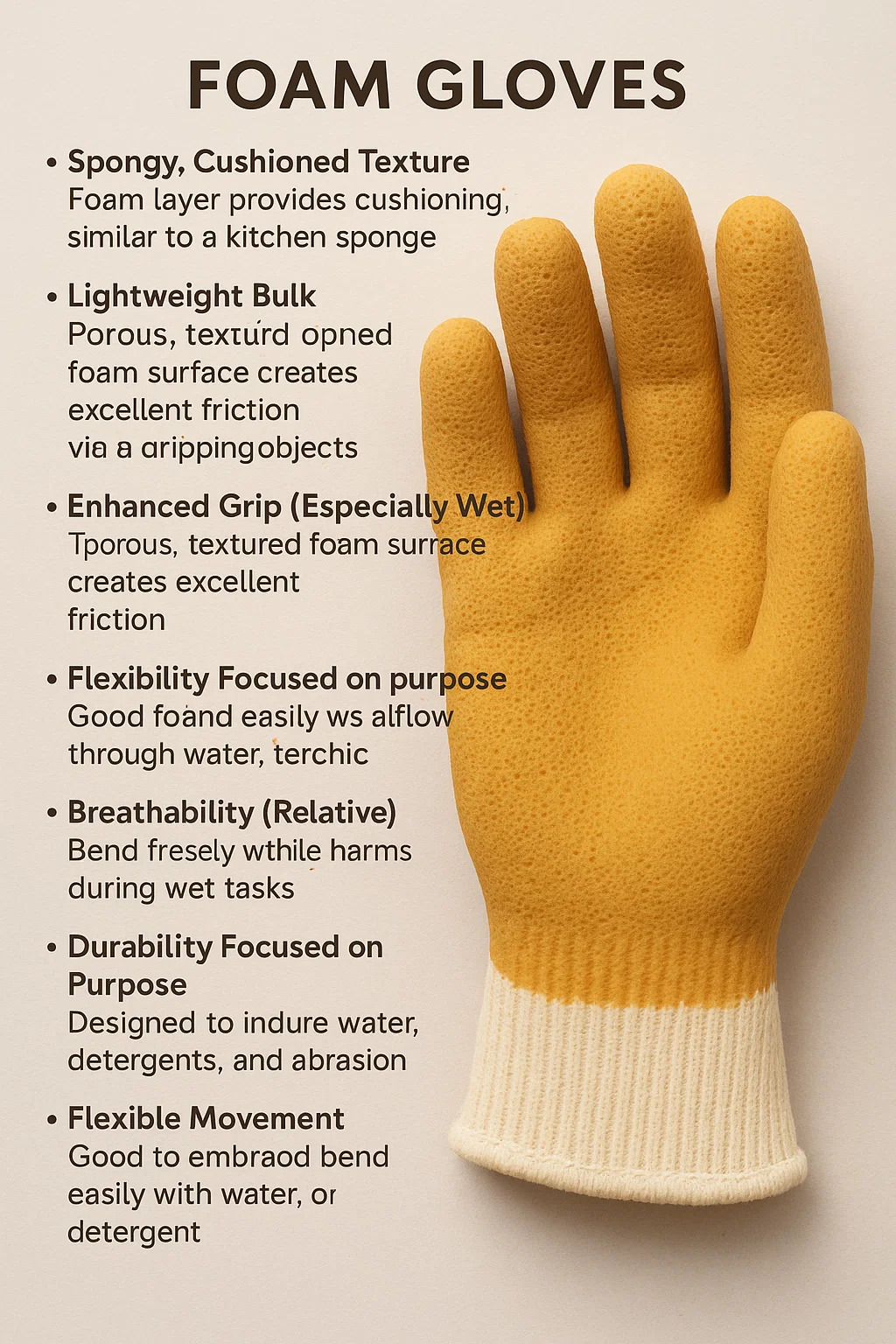 A maioria das luvas de espuma tipo limpeza apresentam um forro de tecido (algodão, poliéster) para maior conforto na pele, mergulhado em espuma de látex ou PVC.