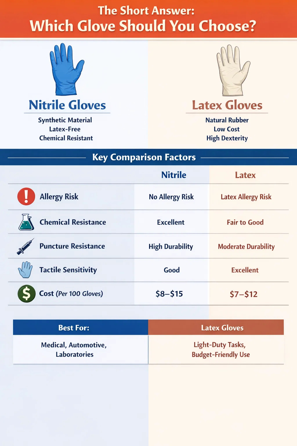 | Custo (por 100 luvas) | US$ 8–US$ 15 | US$ 7–US$ 12 |