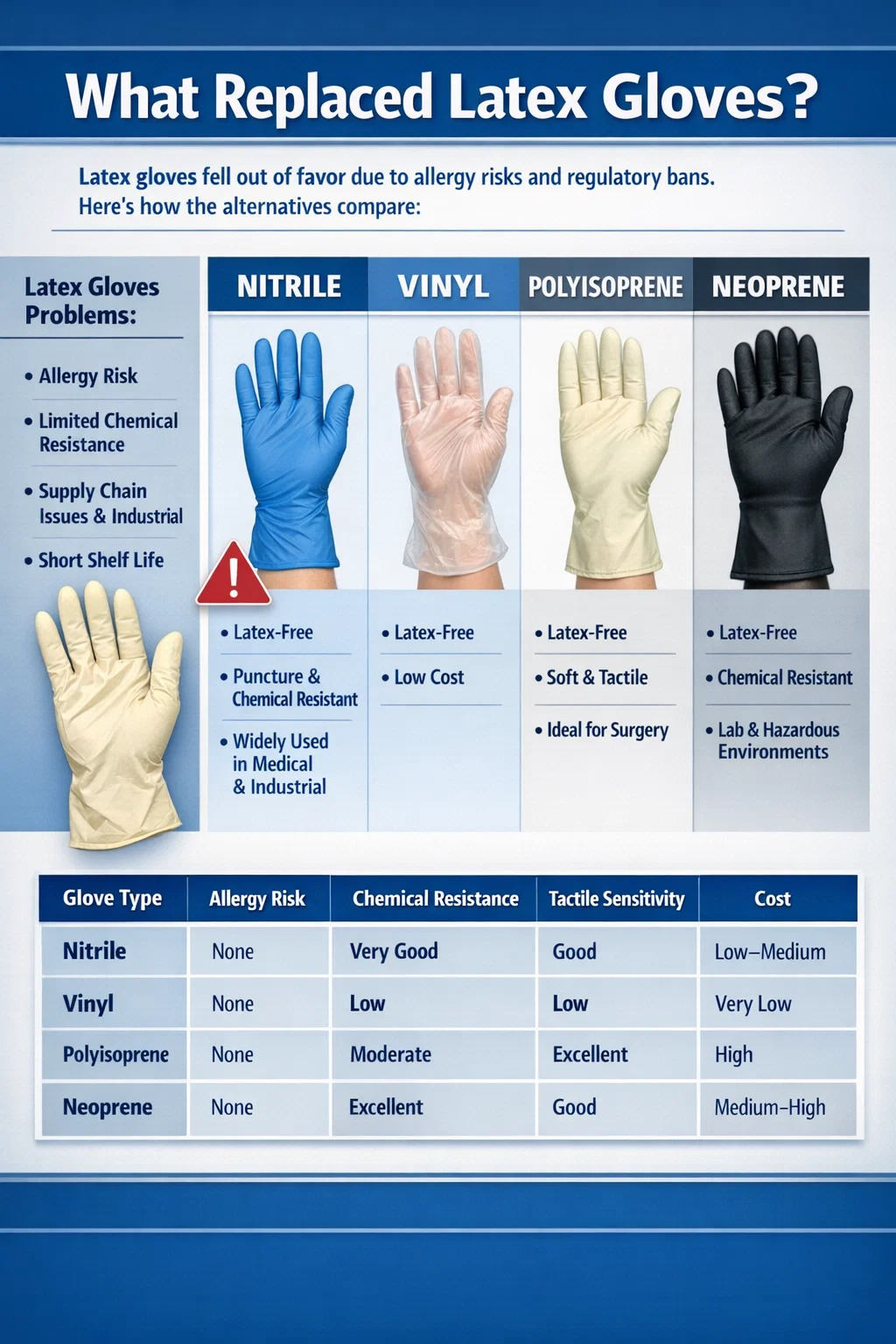 Se você está procurando uma resposta direta, as luvas de nitrila são o substituto dominante das luvas de látex na maioria dos setores atualmente. Seja em hospitais, clínicas odontológicas, fábricas de processamento de alimentos ou oficinas automotivas, o nitrilo superou o látex como material de escolha para luvas. Esta mudança começou a acelerar na década de 1990, quando as taxas de alergia ao látex entre os profissionais de saúde subiram para níveis alarmantes – alguns estudos encontraram taxas de sensibilização tão elevadas como 17% entre profissionais médicos regularmente expostos . Desde então, os fabricantes, reguladores e equipas de compras têm favorecido cada vez mais alternativas sem látex.
