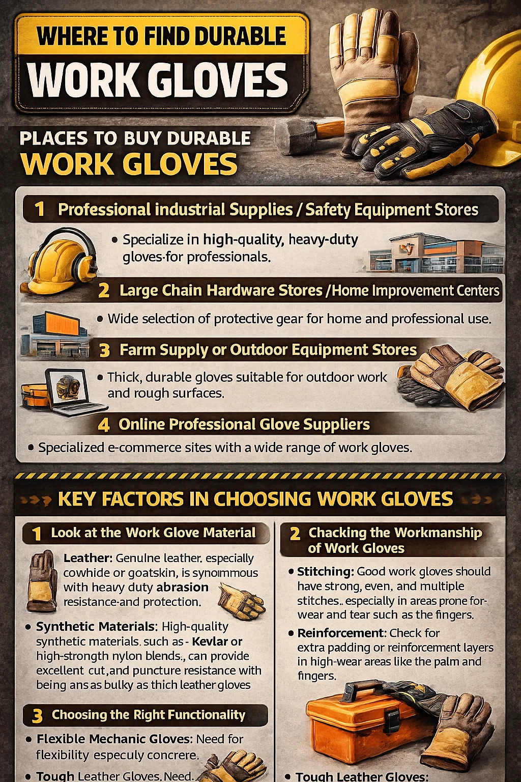 Se você precisar de luvas de trabalho para trabalhos pesados, como manusear madeira, ferramentas afiadas ou trabalhar ao ar livre, considere estes locais.